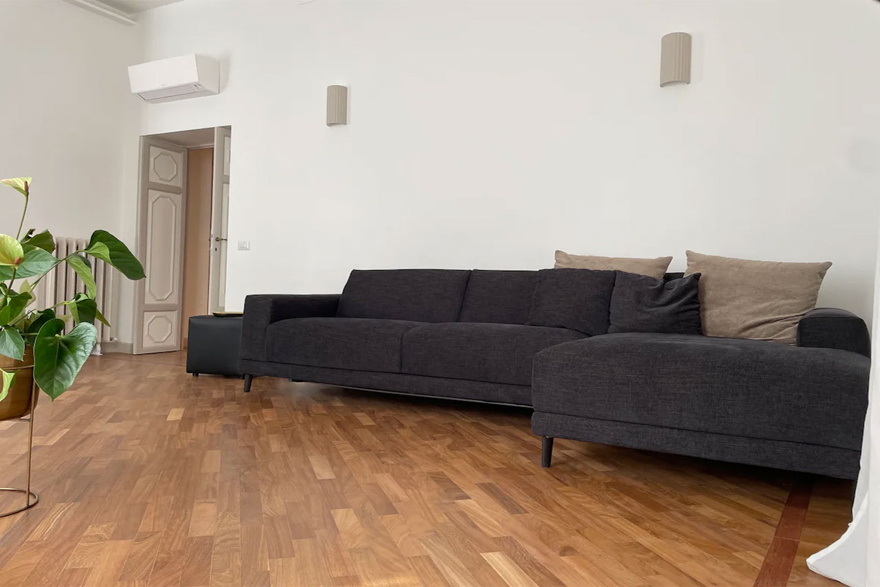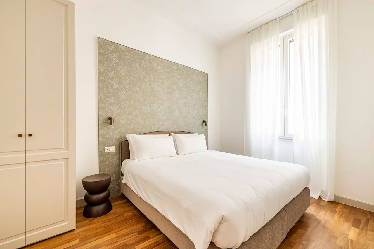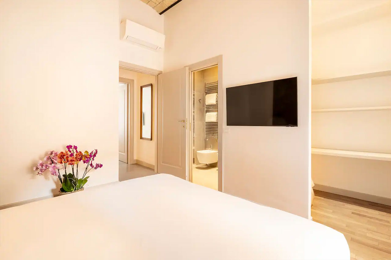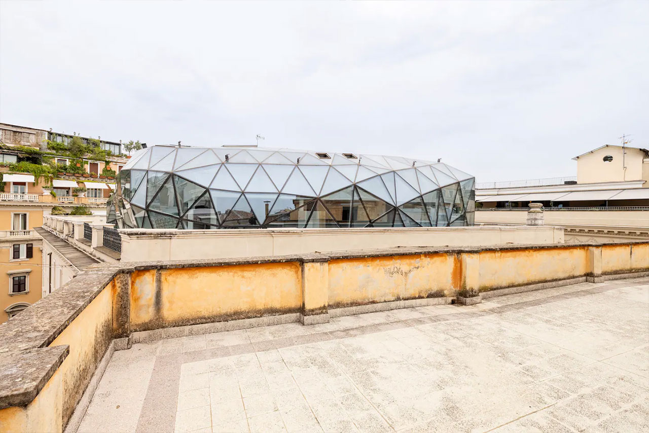 The apartment is very bright because it is located on the third floor of a historic Roman building.