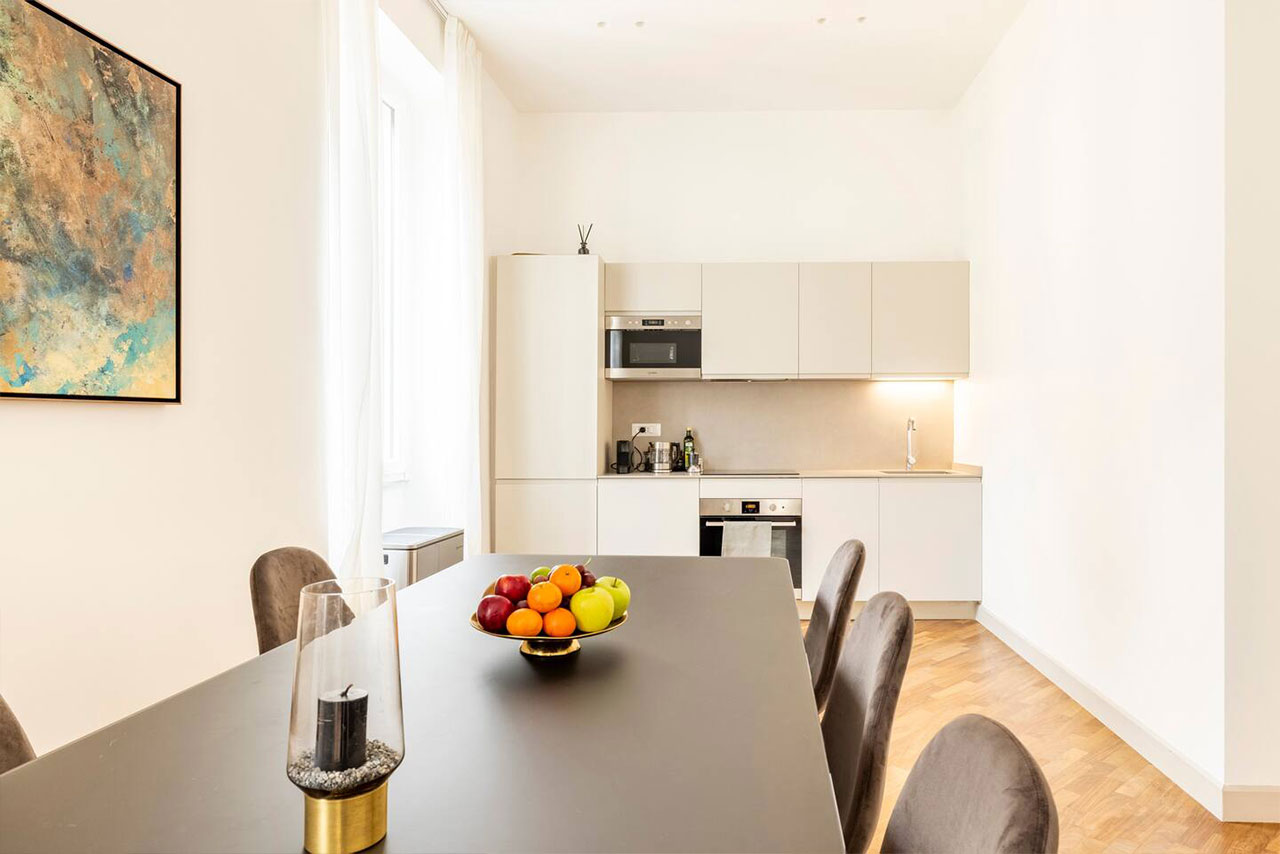 The living room of over 33 sqm features a large chaise longue sofa (elegant double sofa bed), a large table and a functional open kitchen with all necessary amenities and appliances.