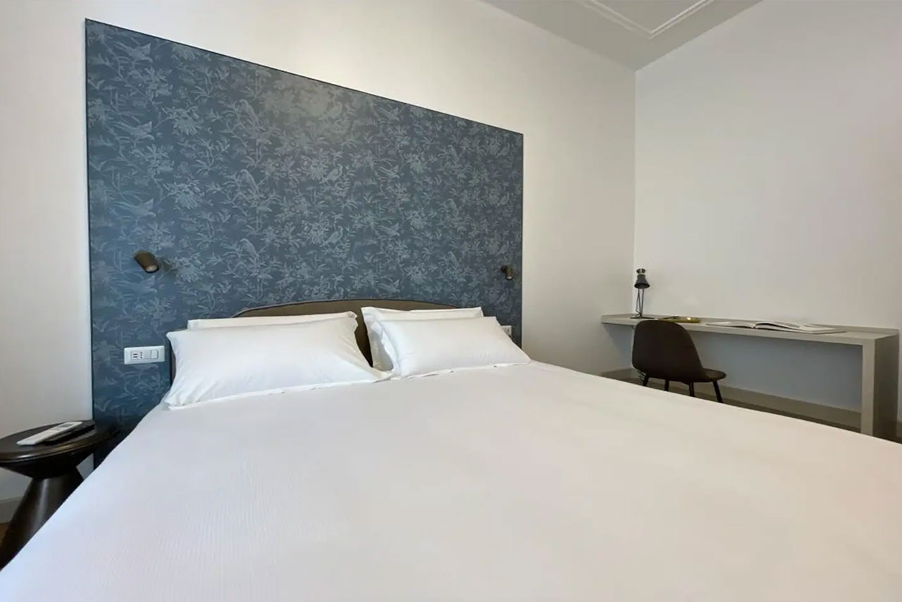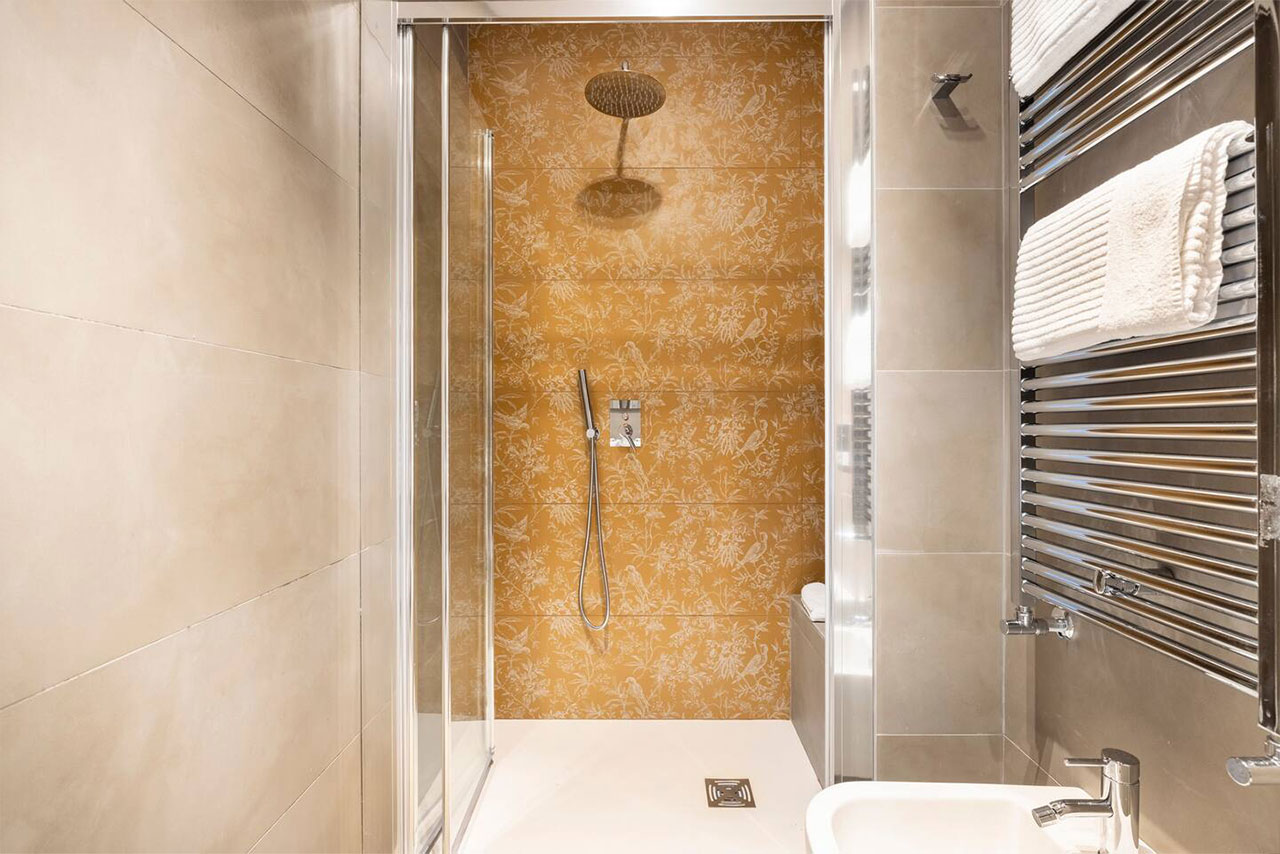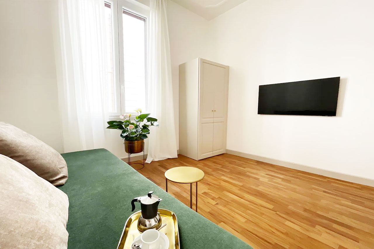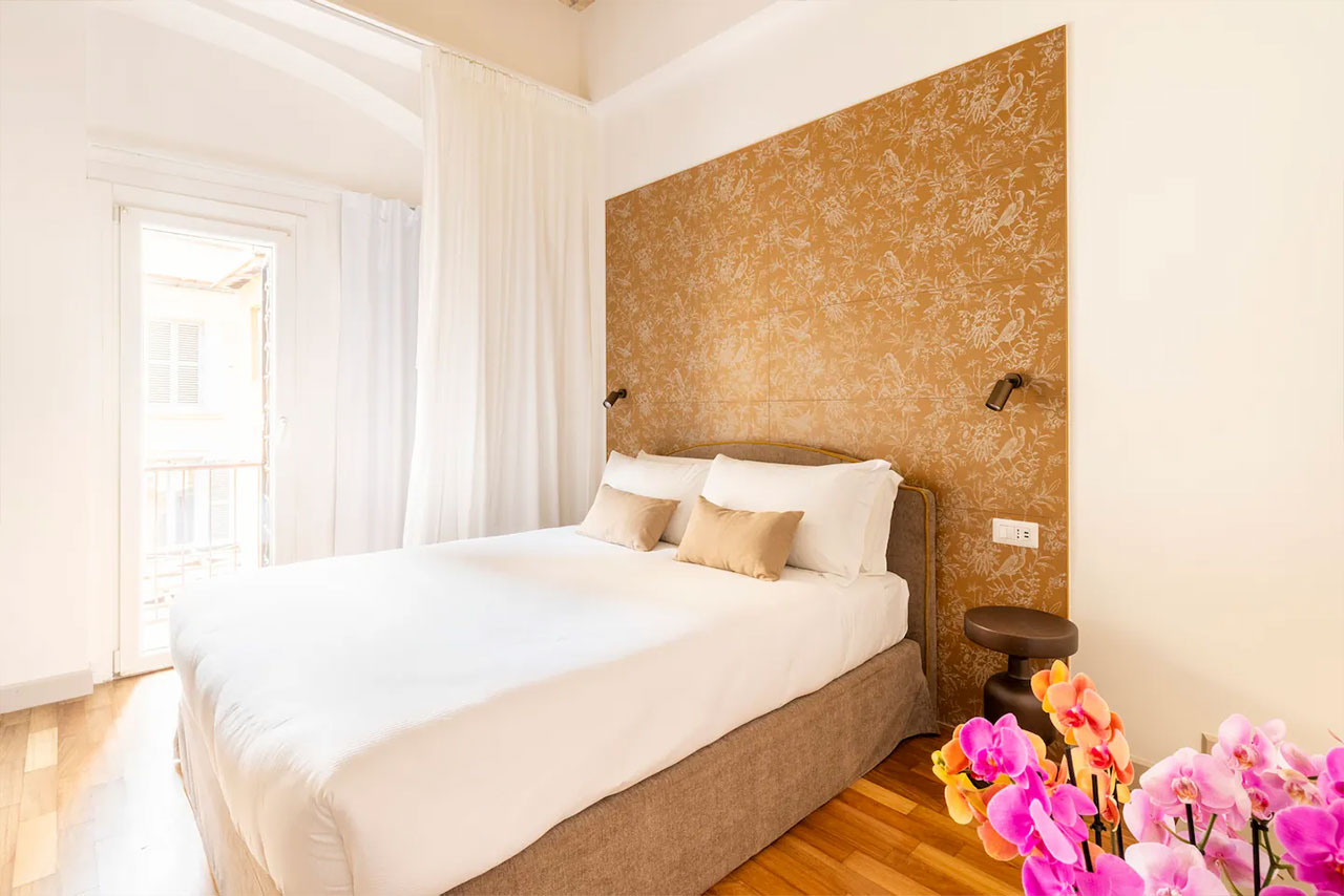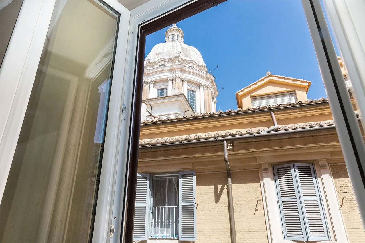 The double room, which overlooks Via Tomacelli, enjoys an en-suite bathroom with a bathtub, while the one facing Via del Grottino has an en-suite bathroom with a built-in shower seat. This double room is also characterized by an original vaulted ceiling and there is a small balcony where you can admire the dome of the Basilica of Sant’Ambrogio and San Carlo, the national church of the Lombards who live in Rome.