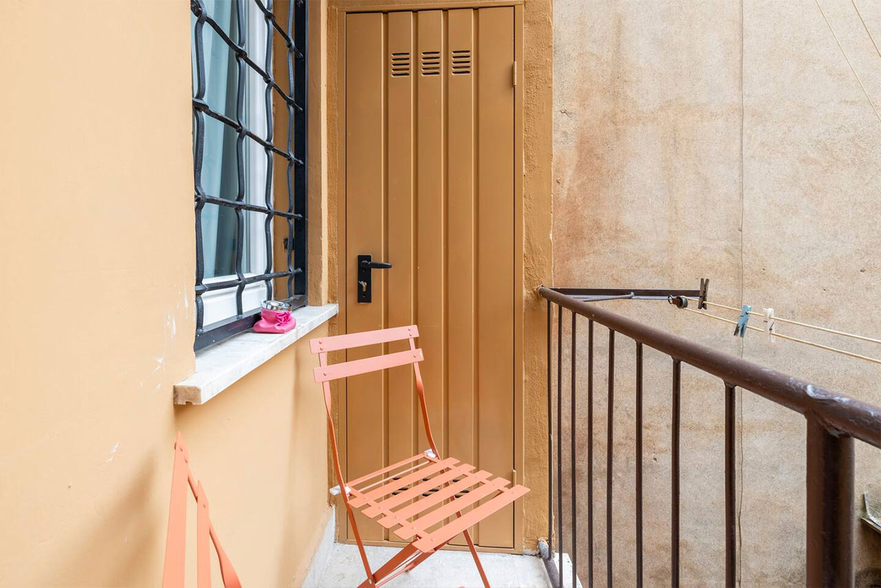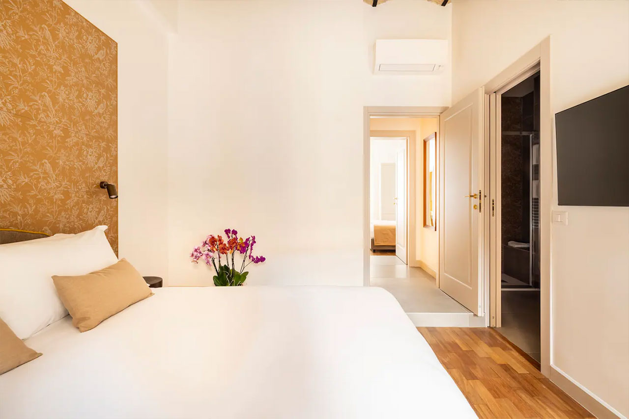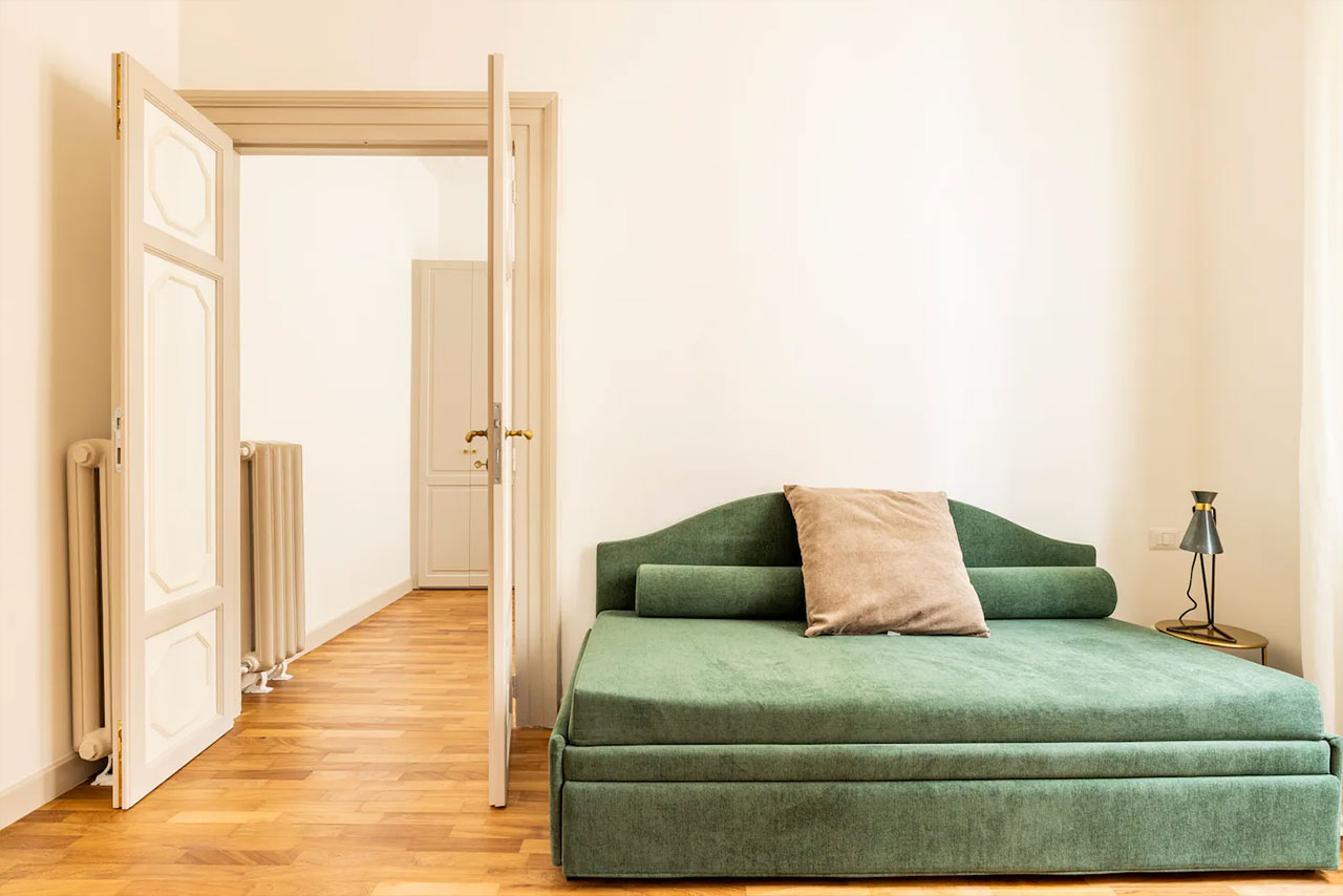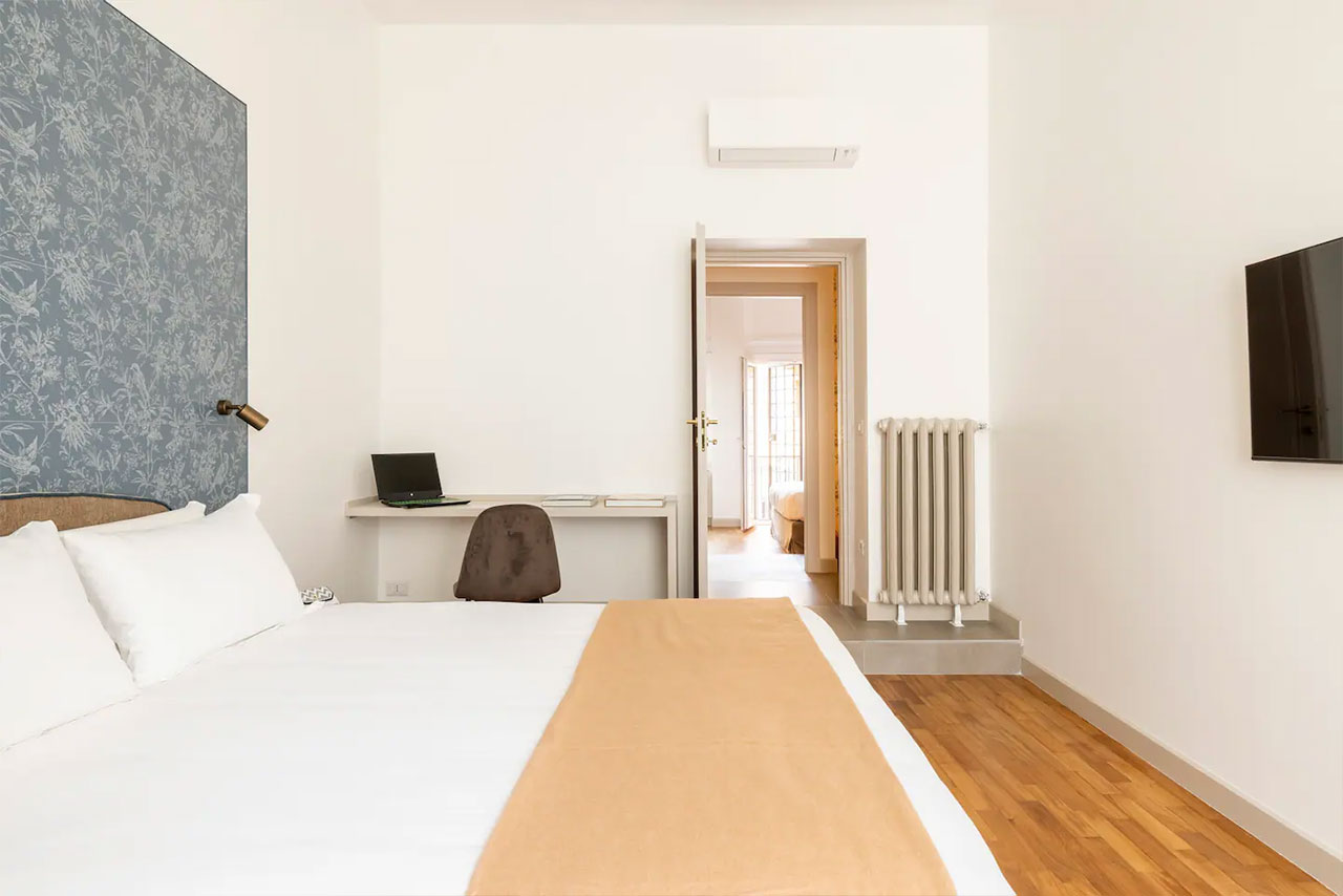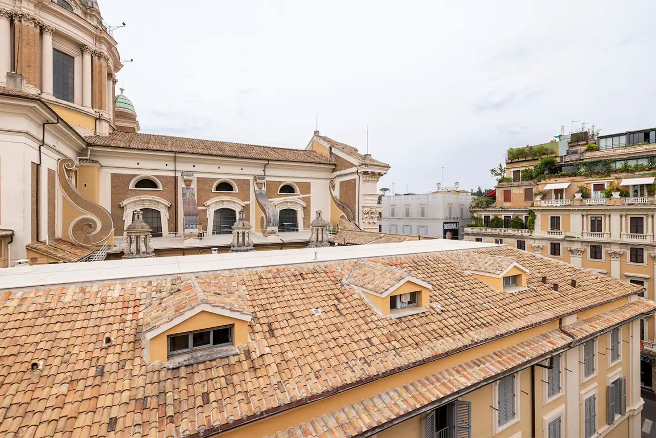 The bedroom and adjacent parlour room overlook Via del Leoncino, parallel to Via del Corso, and the historic Palazzo della Unione Militare where “the Lantern” of Fuksas stands.