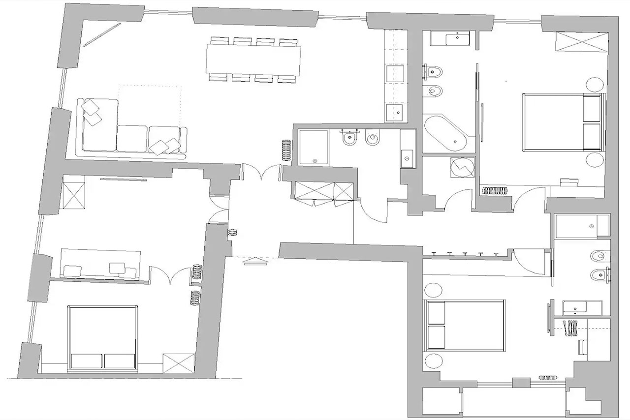 The elegant living room of more than 33 sqm, illuminated by three large windows, from which you can admire Via dei Condotti, Via del Corso and Palazzo Fendi, characterizes the entire apartment.